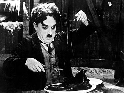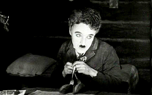 Chaplin hace de un buscador que sufre porque no encuentra oro pero sobre todo porque no tiene para comer. La escena en la que cocina un zapato es antológica; La elegancia con que prepara el pedazo de cuero y la forma como degusta los cordones – espaguetis y las puntillas como si fueran costillitas, la hace dramáticamente risible.